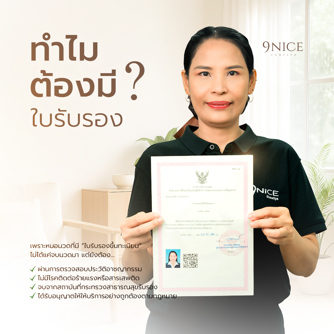 9Nice 每位按摩师均持有泰国劳动局与卫生部认证的按摩毕业证书、健康证明及无犯罪记录证明,并接受数百小时系统化专业培训,拥有丰富经验。